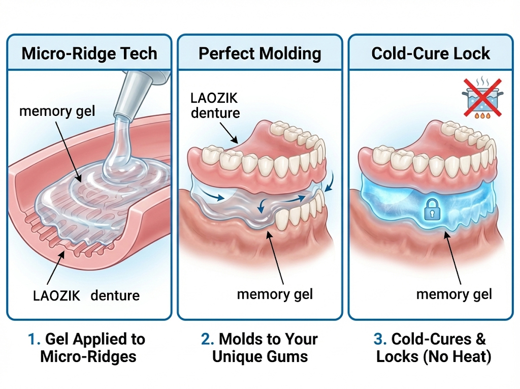 The outer base features a micro-ridge design that guides the gel to perfectly match your gum line and alveolar ridge. After just 30 minutes, a cold-curing memory layer locks in your custom fit — no boiling, no heat needed.