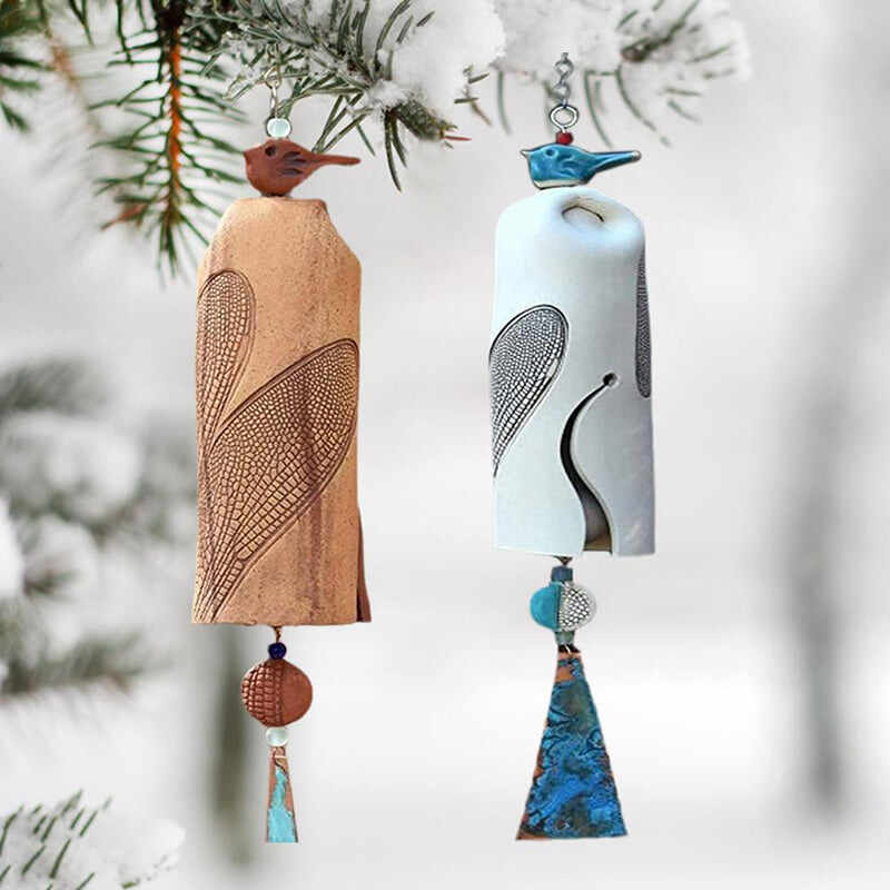 This handmade clay wind chime features a beautiful carved dragonfly pattern,accented by a large copper wind sail with a patina finish.A small ceramic sculptured blue bird of happiness sits atop the bell.My wind chimes serve so many purposes,besides just beautiful garden décor.